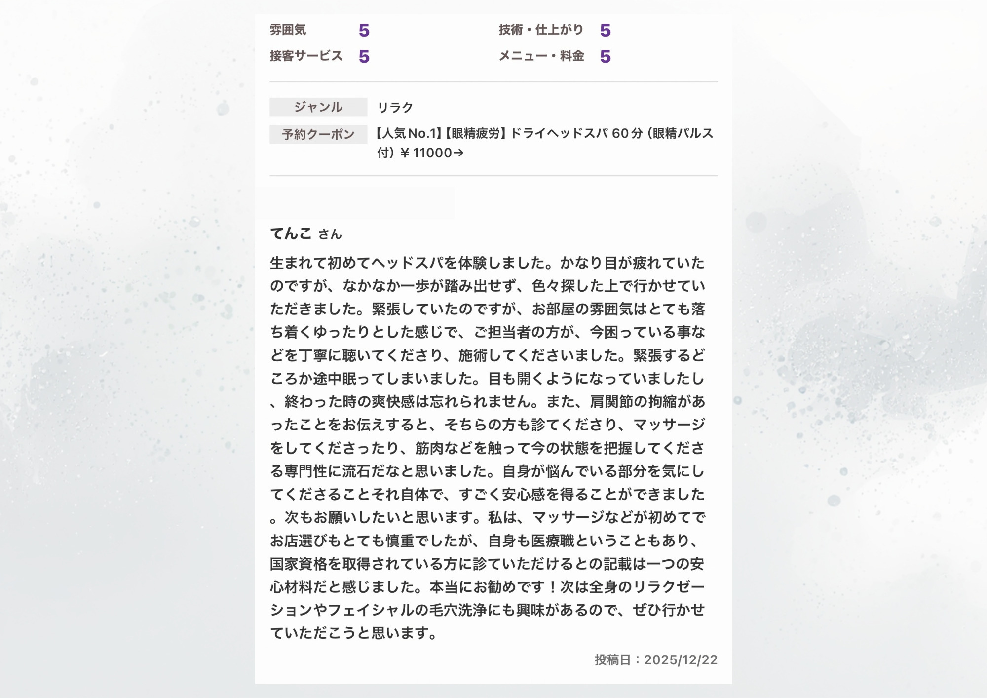 【究極睡眠ドライヘッドスパ】45分+肩マッサージ15分